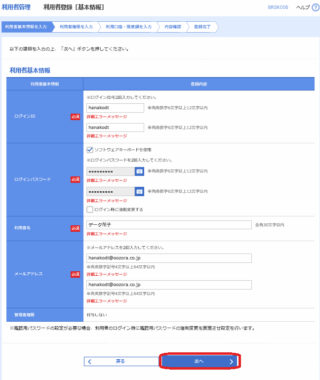 一般ユーザのログインID、ログインパスワード、利用者名、メールアドレスを設定し、[次へ]ボタンをクリックしてください。