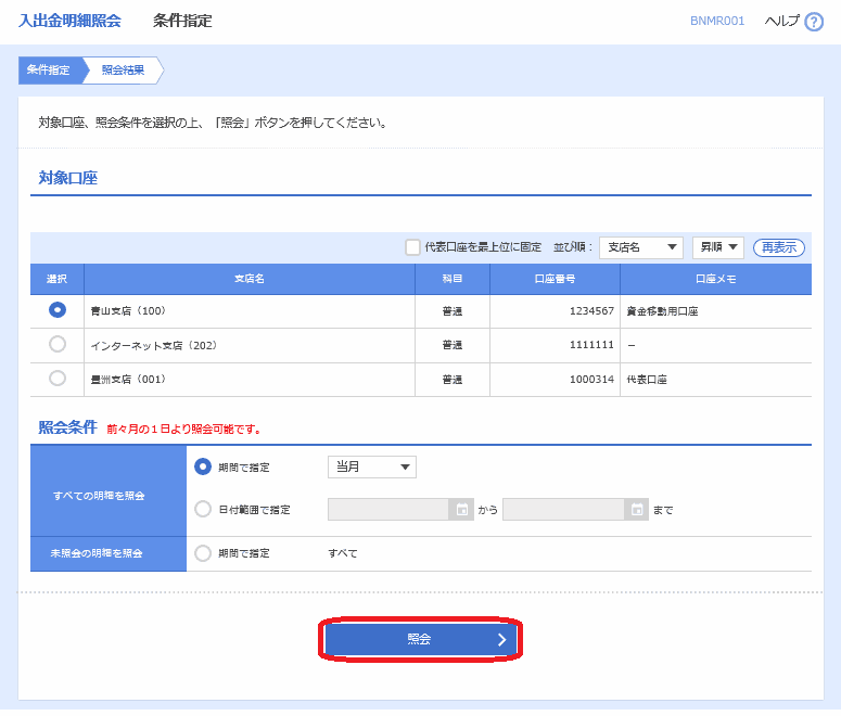 入出金明細を確認する口座、照会する範囲を選択のうえ、[照会]ボタンをクリックしてください。